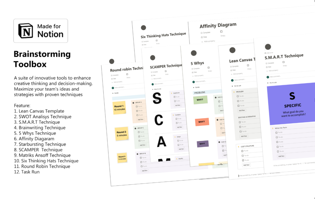 A suite of innovative tools to enhance creative thinking and decision-making. Maximize your team's ideas and strategies with proven techniques.