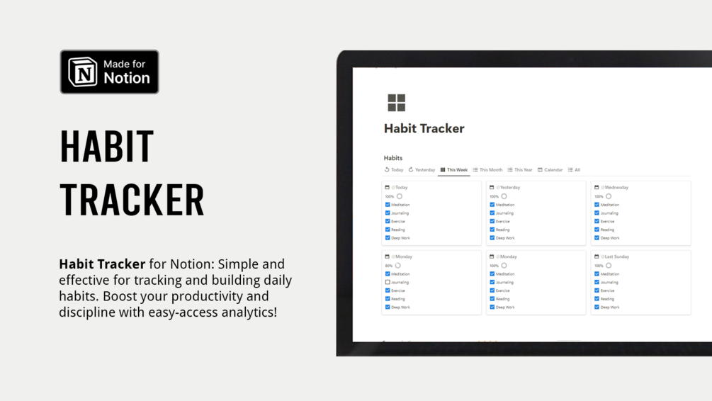 The Notion Habit Tracker template is designed to help you turn positive habits into a regular part of your daily routine in an organized and structured way. By using this tool consistently, you can enhance productivity, health, and overall quality of life.